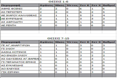 Στην δεύτερη θέση της βαθμολογίας με δύο νίκες επίσης αλλά στους 5 πόντους, το Περιστέρι που νίκησε 3-0 την Αφροδίτη. Στην τρίτη θέση ακολουθεί ο Ίκαρος με 4 πόντους, καθώς η ομάδα της Καλλιθέας επιβλήθηκε με 3-0 της ΑΕ Ρέντη για την πρώτη νίκη της στην εξάδα.