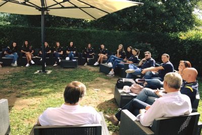 Στην παρθενική συνάντηση που είχε την περασμένη εβδομάδα η ομάδα της Τρεντίνο Ρόσα σε ρεστοράν στις όχθες της λίμνης Caldonazzo, στο Calceranica, έγινε μια σύντομη και ανεπίσημη γνωριμία της ομάδας, μετά την καθιερωμένη συζήτηση και φωτογράφηση στα «τζιαλομπλού». Από την “πρώτη” της ομάδας, απουσίαζαν μόνο η διεθνής άσος της Ουγγαρίας, Μπερναντέτ Ντεκανί, λόγω των διεθνών της υποχρεώσεων και η νεαρή Ιλένια Μόρο, που μετείχε στο Μικιελέτο, στα τελικά του ιταλικού πρωταθλήματος νεανίδων μπιτς βόλεϊ.