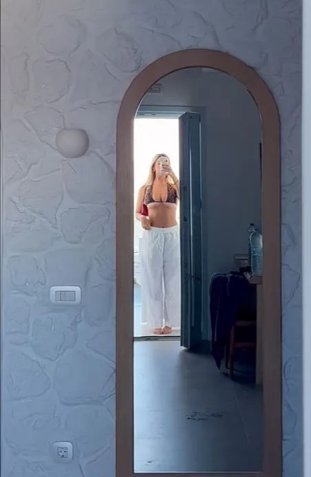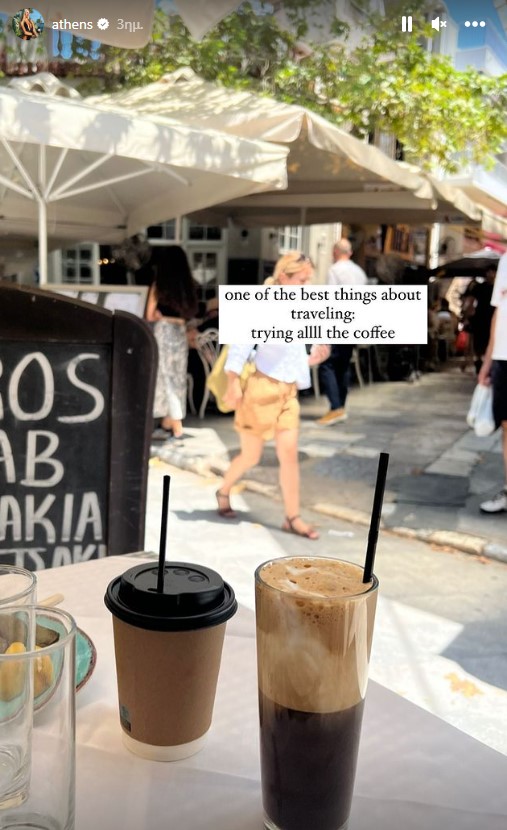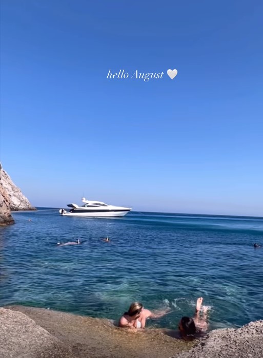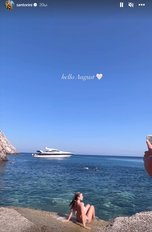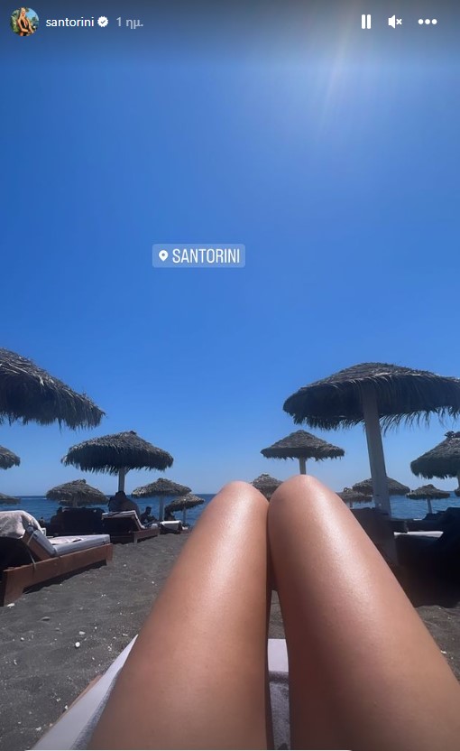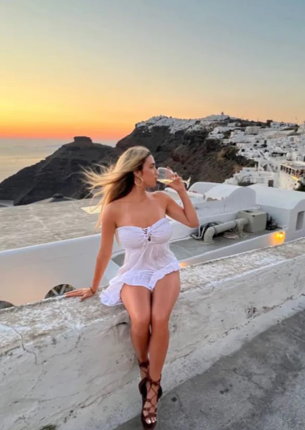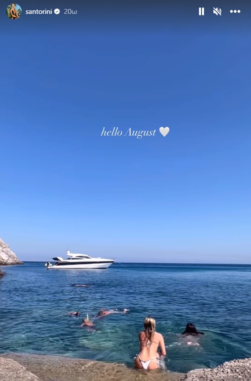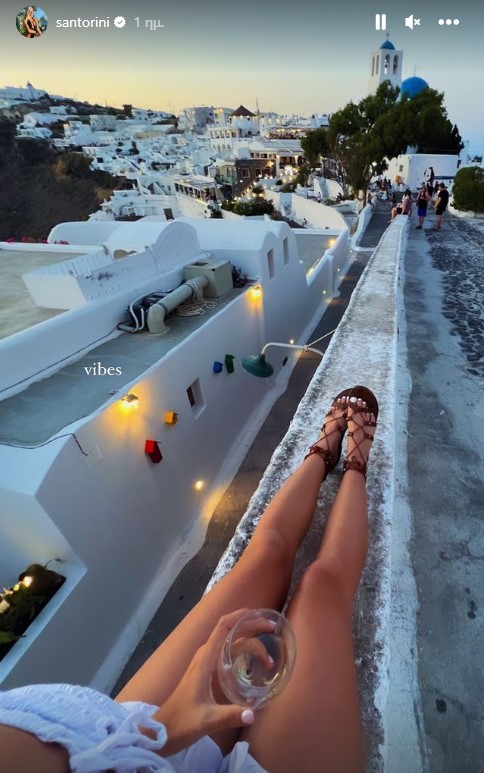 Στην πιο πρόσφατη ανάρτησή της, τη βλέπουμε με στενό λευκό crop top να απολαμβάνει το μπάνιο της παρέα με μία ακόμη φίλη της σε μια παραλία του νησιού, αλλά και να ποζάρει στο ηλιοβασίλεμα πίνοντας ένα ποτήρι λευκό κρασί, σε ένα γραφικό σκηνικό στην Καλντέρα.